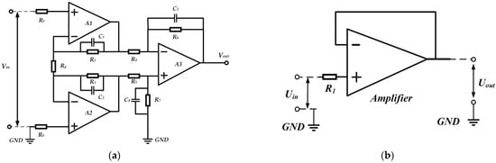 Schematic diagram of signal conditioning circuit. (a) The new circuit; (b) the old circuit.