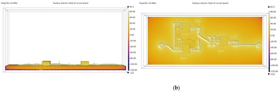 Figure 6 shows the transient electric field on the whole circuit board surface and the transient electric field induced on the internal surface of the metal case generated by the transient voltage from the input port of the signal conditioning sensor. In order to visually represent the size of the radiation field, we perform logarithmic operation on the amplitude of the electric field to convert the unit of the field strength into the decibel value. We notice that the transient signal induces a strong transient field around the circuit, which almost covers the entire circuit board. The maximum amplitude of the transient field around the circuit can reach 82.2 dB, which will decay to about −20 dB only in the four corners of the circuit board. Similarly, the electromagnetic field radiates from the patch pin on the surface of the circuit board to the internal space of the device, and the intensity of the induced field on the surface of the metal shell is usually about 20 dB. Figure 6b shows that the amplitude of the surface electric field generated by the transient signal in each part of the circuit is basically the same, and a large surface electric field can only be excited when passing through some small apertures. The maximum value of the surface electric field is about 82.2 dB, and the minimum value is about 122 dB, which is located on the lower surface of the circuit board. Therefore, in order to reduce the interference of the surface electric field, the use of vias with too small an aperture will be avoided when connecting circuits in the circuit board design. Moreover, long and thin leads will also be avoided, so as to reduce the large surface radiation electric field.