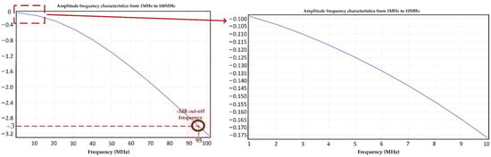 Furthermore, the response change characteristics of the signal conditioning circuit in the range of 1 MHz to 100 MHz are calculated, as shown in Figure 7. It can be found that the amplitude of the signal in the frequency band range of 1 MHz to 10 MHz has only 0.075 dB attenuation. The −3 dB high-frequency cut-off frequency of the circuit is about 95 MHz, which indicates that this signal conditioning sensor can meet the measurement requirements of different components in VFTO signal.