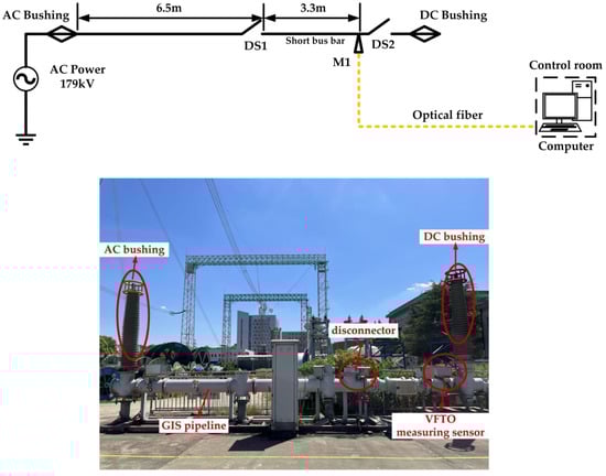 In this study, about 500 VFTO measurement experiments were carried out during disconnecting operations on a 220 kV GIS circuit, and the actual characteristics of the VFTO measuring sensor were verified. The 220 kV GIS circuit is composed of two disconnectors (DS1 and DS2), two bushings (AC side bushing and DC side bushing), and a long and straight GIS pipeline, as shown in Figure 10. Among them, the DS1 is the main disconnector used to generate VFTO by repeated operations, and the DS2 is an auxiliary disconnector, which is always disconnected. The AC side bushing is used to connect with an AC power supply with amplitude of 179 kV and frequency of 50 Hz. The DC side bushing is usually in a no-load state. During the tests, the VFTO measurement system is installed at M1 point in the GIS pipeline. This measurement point is located at the end of the no-load short bus between DS1 and DS2. Therefore, the measured results can simultaneously reflect the quasi-DC component, power frequency component, and high-frequency transient component in VFTO.