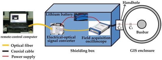 The overall structure of the VFTO measurement system is shown in Figure 11, which mainly includes five parts: a capacitive voltage divider, signal conditioning sensor, electrical–optical signal converter, field acquisition oscilloscope, and remote-control computer. The input port of the signal conditioning sensor is directly connected to the secondary output port of the capacitive voltage divider, and its output port is directly connected to the field acquisition oscilloscope. The oscilloscope was powered by a lithium battery through a DC–AC inverter to avoid ground potential difference conduction disturbance, and it communicated with a computer through a fiber-optic communication system to realize remote control. These devices were all installed in the shielding box to avoid the influence of transient disturbance during disconnector operations.