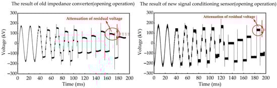 In our study, the performance of the signal conditioning sensor is compared by calculating the proportional coefficient  of trapped charge voltage attenuation. As shown in Figure 14, the attenuation proportional coefficient  of trapped charge voltage is defined as the change degree of trapped charge voltage at the beginning of the next high-frequency oscillation pulse in the two adjacent high-frequency oscillation pulses relative to the trapped charge voltage at the end of the last high-frequency oscillation pulse. Its formula is as follows: