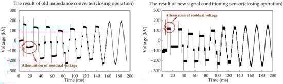 The typical full-time waveform of VFTO measured by the new signal conditioning sensor and the old impedance converter during closing operation.