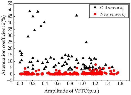 Nearly 500 groups of attenuation proportional coefficients were counted, and the results are shown in Figure 15. The black triangle symbol represents the results of the old impedance converter defined as , and the red circle symbol represents the results of the new signal conditioning sensor defined as . We notice that the statistical eigenvalues of  approximately distribute between 5% and 15%, and there is also a very bad situation in which some eigenvalues of  reach 45%. However, the statistical eigenvalues of  distribute between 0.2% and 2.5%, which are more concentrated and smaller than that of . Generally, the distribution of  is relatively scattered without strong regularity, but the distribution of  is very dense and more uniform with a smaller dynamic error range. It can be easily concluded that the smaller the eigenvalues, the less the attenuation of trapped charge voltage. Therefore, the new signal conditioning sensor has a lower and more stable low-frequency characteristic than the old impedance converter.