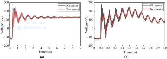 The fast high-frequency oscillation pulse reflects the high-frequency transient performance of the signal conditioning sensor. Expanding the full waveforms, the typical waveforms of the fast high-frequency oscillation pulse can be observed in Figure 16. Among them, the red curve represents the measurement result of the new signal conditioning sensor, and the black curve represents the measurement result of the old impedance converter. From the time-domain process of these oscillation pulses, it can be found that the overall change trend of these waveforms is almost consistent. After a rapid rise within several nanoseconds, the high-frequency oscillation pulse turns into a damping oscillation attenuation process with a fixed oscillation frequency of about 10 MHz and attenuates to zero after several microseconds. However, it can be found that the result of the rapid oscillation process is much different within 0.3 microseconds in the beginning of the transient pulse. In the measurement results of the impedance converter, the wave peak amplitude at 0.1  moment and the wave valley amplitude at 0.15  moment have dramatic changes, which is caused by the superposition of multiple small oscillation waves with a frequency of more than 70 MHz on the main oscillation waveform with a frequency of 10 MHz. These tiny oscillation waveforms almost lasted several microseconds before gradually decaying to zero. However, in the measurement results of the signal conditioning sensor, it is difficult to find such small oscillation waveforms with a frequency of more than 70 MHz.