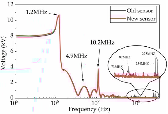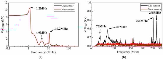 Furthermore, the fast Fourier transform (FFT) is used to obtain the spectrum characteristics of the high-frequency oscillation pulse to distinguish the difference in measurement results. As shown in Figure 17, the measurement results of these two sensors are almost the same at 1.2 MHz, 4.9 MHz, and 10.2 MHz, respectively. However, the results are obviously different at the frequencies of 73 MHz, 87 MHz, 254 MHz, and 275 MHz.