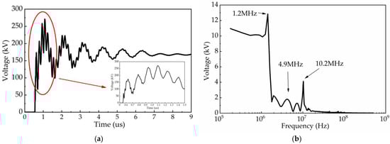 The simulation results of VFTO in time domain and frequency domain. (a) Time-domain simulation results; (b) Frequency-domain simulation results.