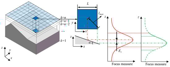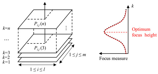 Specifically, by changing the camera height, an image sequence with an equal sampling step is obtained. Each pixel in the image sequence is represented by Pi,j(k). i, j indicate the x and y position of the pixel, respectively, and k is the image frame number in the z direction. The focus measure operator measures the sharpness of the pixel [35]