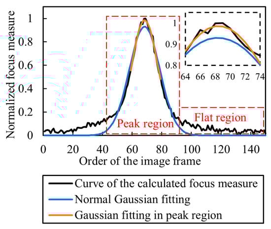 In the literature, Gaussian fitting is used to find the optimum focus height [15,20,38]. The focus curve typically has both flat and peak regions [39]. The flat region reduces the accuracy of Gaussian fitting. As the optimum focus height is determined by the peak region of the focus curve [18], Gaussian fitting taking into consideration only the peak region can avoid the influence of the flat region and improve the fitting efficiency, and the half-peak width of the focus curve is used as the criterion to get the peak region. Figure 2 shows that the fitted Gaussian curve which considers the peak region is closer to the focus curve than the traditional Gaussian fitting method over all regions.