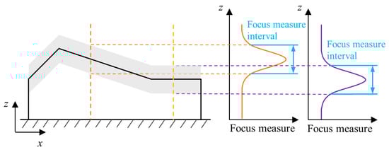 The basic principle of SFF is to select the sharpest pixel from the image sequence and along the optical axis to obtain the height matrix of the measured object surface [28,33]. In practice, the image sequence is acquired by changing the camera height from the measured object with an equal sampling step. According to the imaging principle [34], the sharpest areas of the imaged object surface at different heights should appear in the corresponding order of the image sequence. Therefore, pixels at the same 2D x-y position have different degrees of sharpness in the image sequence. The height of the sharpest pixel in the image sequence can be determined by calculating and comparing the degree of sharpness of the pixels at the same x-y position over the image sequence in the z height direction (Figure 1). Finally, the height matrix of the measured object surface can be obtained by combining the x-y position information with the z height information of all the sharpest pixels in the image sequence.