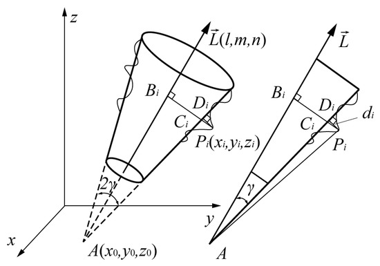 The extraction of the semi-vertical angle is obtained by point cloud fitting and the minimum zone evaluation method based on particle swarm optimization (PSO) is used for fitting. An ideal cone can be expressed by three parameters: cone apex A(x0, y0, z0), semi-vertical angle γ and axis vector (l, m, n), as shown in Figure 6. The axis vector can be expressed as [40]