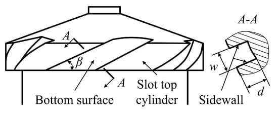 The swirl slot is composed of the top, bottom and side surfaces. The top and bottom surfaces are cylindrical surfaces; the side surface is helical, as shown in Figure 7. The key dimensions of the slot are the depth d, helix angle β and width w. Figure 8 divides the obtained point clouds on the slot surfaces into three parts, i.e., top (red), bottom (green) and side (blue). Cylinder fitting is applied to the top point cloud and the bottom point cloud. The cylinder fitting method is a special type of cone fitting with γ equal to 0, as in Section 2.4.1 [40]. The difference between the radii of the two cylinders obtained by fitting is the slot depth d. To obtain β and w, the whole point cloud is mapped to a Cartesian coordinate system according to the following relationship [41]