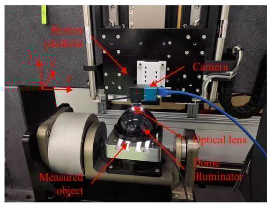 In order to verify the proposed three-dimensional measurement method using SFF, an experimental platform was established as shown in Figure 10. The system mainly comprises a camera (Daheng Image Beijing, China, MER2-1220-32U3C-W90), a telecentric lens (Edmund Optics Shenzhen, China 1 × 40 mm WD CompactTL™ Telecentric Lens), a dome light source and a motion platform. The motion platform has a worktable, and a z-axis motion module driven by a linear motor and control module (Beckhoff CX2020). The camera is installed on the z-axis motion module in order to ensure the lens optical axis is parallel to the z-axis direction. The measured object is placed on the worktable, and the light source is placed on the top of the measured object. Detailed parameters for the experimental platform are shown in Table 2.