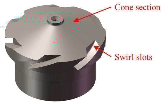 Inner part of a dual-orifice pressure-swirl nozzle.