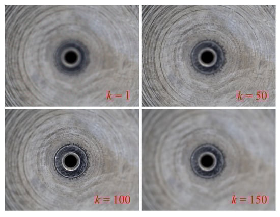 In this paper, the inner part of dual-orifice pressure-swirl nozzle is measured, as shown in Figure 11. The nozzle is made of 9Cr18, the manufacturing process is the cone section being processed by turning, and the swirl slots are processed by milling. Before measurement, the camera is moved downward and approaches the nozzle until the image is completely blurred. This position is set as the initial position, and the corresponding image frame number is k = 1. The camera begins to move upward with the optimal sampling step size obtained from the sensitivity analysis, and captures an image at every sampling step until the image is completely blurred again. Figure 12 shows several sample images of the image sequence, which shows a trend from completely blurred to partially blurred, and again completely blurred. All computations of image sequence are run on a PC with Intel i7 10700F processor and 16 GB RAM in Matlab R2021a.