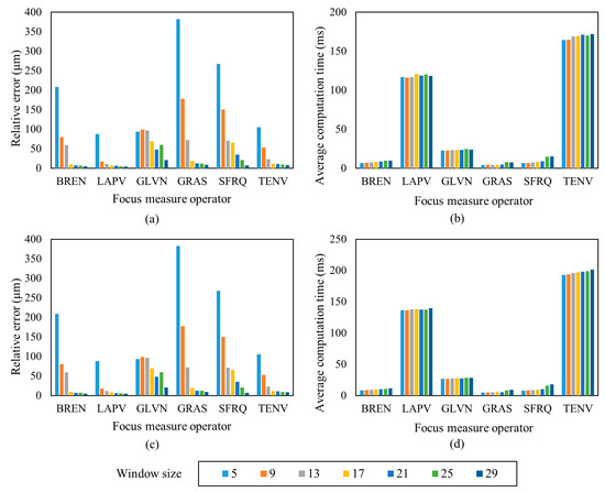 For this reason, the present paper selects the dispersion of points extracted from a standard plane with a very small flatness to conduct the sensitivity analysis. To quantify the dispersion of points, the root mean square error (RMSE) of the standard plane is used. In addition, RMSEs from the proposed method and the data of Keyence VK-X1000 3D laser scanning microscope are compared to choose the final focus measure operator and window size. Pertuz et al. [20] comprehensively evaluated the performance of 36 focus measure operators. Based on the existing experimental platform and workpiece, this paper evaluates the performance of the above 36 operators and selects the final 6 operators with better performance for further evaluation. The window size selection is 5 × 5 to 29 × 29 pixels from the literature and our own experience. The abbreviations and equations for focus measure operators are shown in Table 1.