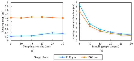 Standard gauge block plane measurement with different sampling step sizes. (a) Measurement error and (b) Computation time.