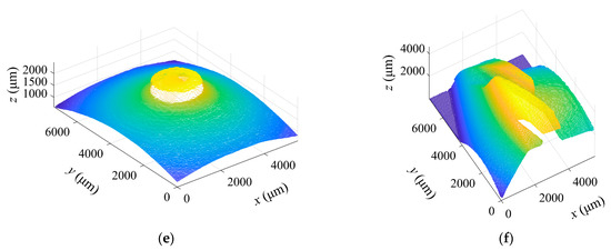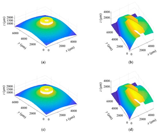 Figure 16c,d show the point clouds obtained using the focus measure interval approximate method. The results indicate that compared with the traditional method, the average computation time of the focus measure of each pixel position for the cone is shortened from 2.431 ms to 0.506 ms, reducing computation time by 79.19% and the average error of the optimum focus height over all pixel positions is 0.26 μm. As the swirl slot has many areas with large slope angles, the effect of this method may be reduced. Therefore, compared with the traditional method, the average computation time of the focus measure of each pixel position is shortened from 6.635 ms to 4.094 ms, giving a computation time decrease of 38.30% and the average error of the optimum focus height is 0.23 μm. Obviously, the proposed method has a minimal impact on the measurement accuracy and significantly reduces the computation time.