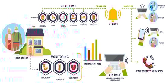 Aging in older adults is associated with an increased need for long-term care because mobility is lost, frailty increases and sequelae due to physical or mental illnesses increase disability rates [37]. Several studies suggest that environmentally assisted living (AAL) is a key enabler for an aging society [38,39,40,41], especially considering that providing protection and care for older adults living alone can involve high costs. In this regard, the World Health Organization points out that the global cost of caring for elderly people with dementia was US $818 billion in 2015, equivalent to 1.1% of the global domestic product (GDP), and the figure is estimated to continue to rise [42].