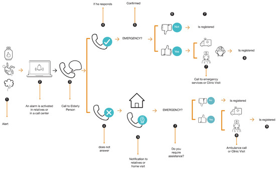 The developed product, Quida, is the result of a process of continuous improvement through various research studies [29,30,31,32,33,34,35,36]. In particular, [29] used very low-resolution thermal sensors to classify falls and then alert care personnel. In addition, the performance of three recurrent neural networks for detecting falls was analyzed: short-term memory (LSTM), closed recurrent unit and Bi-LSTM, following, like many learning algorithms, a training phase with different test subjects. After several tests, it can be noted that the Bi-LSTM approach surpasses the other techniques reaching 93% accuracy in fall detection. The bidirectional form of the Bi-LSTM algorithm is estimated to give excellent results because the use of its data is influenced by old and new information, which is compared with LSTM and GRU. The information obtained through this system does not compromise the privacy of the user, which constitutes an additional advantage of this alternative. Quida consists of an integrated monitoring system that is continuous and non-intrusive to the daily activities of older people and capable of detecting risk events or accidents inside and outside the home without using devices that adhere to the body or monitoring private activities without authorization. When a possible event is detected (gas leak, fall or action of the emergency button), an alert is generated that is sent to the relatives and a telephone center (health or community center). If a letter is generated, the protocol is as follows (Figure 1): The staff of the telephone exchange calls the patient by phone to ask him how he is. In option A, if the patient responds and is not facing an emergency, this false positive is recorded on the platform. Otherwise, if the patient has an emergency, they call the emergency services or make a clinic visit to later register on the platform. In option B, if the patient does not respond, her contacts are called, and if assistance is required, the emergency services are called, or a clinic visit is made. Emergency services may include police, fire, and health services, depending on the event occurring.