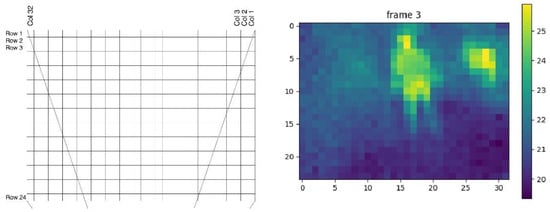 The system’s sensor network can detect presence and movement. The Tri sensors detect presence through increased temperature and movement through the PIR sensor, which detects movement by rapid changes in infrared energy, sending a signal when the person passes through the sensor. In the case of the raspberry, the low-cost MLX90640 thermal sensor composed of 768 pixels (32 × 24 pixels) allows for detection presence, movement and location (Figure 4).