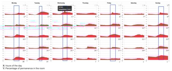 Figure 5 shows that through the temperature sensor in the kitchen, it is possible to deduce a pattern of behavior. Between 13:00 and 14:00, the older adult is in the kitchen.