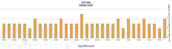To evaluate the nocturnal activity, the record of presence in the rooms of the home and the trajectories made during the night were analyzed, linking them with the nocturia sensor, which records urination events. The high frequency of nocturnal urination events (Figure 7), apart from causing sleep problems, can be symptoms of diseases such as diabetes and kidney problems. Thus, their early identification alerts the clinical team of possible complications in the patient to take action in a timely manner.