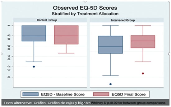 After completing the follow-up, the median score in the EQ-5D was 0.80 (IQR 0.64–1.0) in the control arm and 0.70 (IQR 0.56–0.81) in the control group. When comparing these scores, no evidence of a statistically significant change was found between groups (p = 0.23, Mann–Whitney U-test). However, an additional comparison was carried out to take the baseline imbalance in EQ5D scores between the groups that were mentioned above. The control arm showed no change in its quality of life measured by EQ-5D, with a median change of 0 points (interquartile range, IQR -0.163 to 0.202, intra-group p-value 0.77, Wilcoxon sign-rank test). On the other hand, the intervention arm showed a median increase in its EQ-5D score of 0.135 points (IQR 0–0.302 points, intra-group p < 0.01 Wilcoxon sign-rank test), which represented a 22% increase from baseline. When these differences from baseline between groups were compared using the Mann–Whitney U-test, statistical significance was reached (p < 0.03). The observed difference between groups is shown in Figure 8.