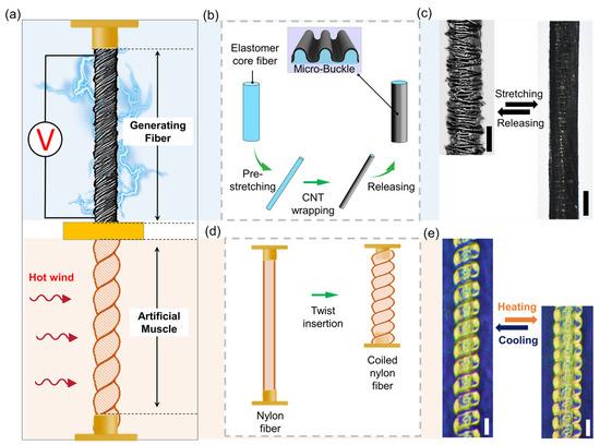 Concept of combined mechano-electrochemical harvesting fiber and thermally responsive artificial muscle: (a) schematic diagram of integrated buckled mechano-electrochemical harvesting fiber and coiled artificial muscle structure; (b) schematic of fabrication process of mechano-electrochemical harvesting fiber; (c) photograph showing elasticity of mechano-electrochemical harvesting fiber (scale bar: 100 µm); (d) schematic of fabrication process of coiled artificial muscle (nylon); (e) photograph showing thermally responsive actuation of coiled nylon (scale bar: 100 µm).