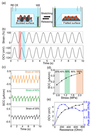 When the fiber was stretched, the unfolding buckle increased the electrochemical capacitance by increasing the active surface area, which increased the voltage. Consequently, the OCV increased from −124 to −120 mV when the fiber was stretched to a strain of 100% (Figure 2b); furthermore, the voltage returned to its initial level when the initial length was restored, because the active surface area decreased. Like the trend of the output voltage, a short-circuit current (SCC) was continuously induced, owing to strain (Supplementary Figure S4).