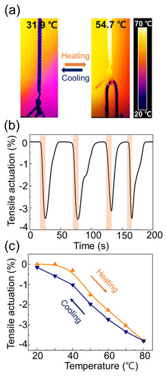 The TAM contracted quickly, and provided a large stroke owing to thermal stimulation (Figure 3a). The reversible thermal contraction of the nylon fiber between 20 and 80 °C represented a tensile stroke of −3.5%. The strongly twisted fibers spontaneously formed a coiled structure, to minimize the strain energy: when this two-end-tethered coil was heated, the untwisting motion in the fiber pushed the adjacent coil loops closer together, shortening the TAM. This actuation was caused by thermal expansion of the polymer and force balance of the twisted structure, providing fast and reversible actuation. When a heat flow of 90 °C was applied to the TAM at 26 °C, contractions were repeatedly observed for 8.5 s (Figure 3b). The TAM rapidly returned to its initial length within 25 s, while cooling to room temperature because of the microscale diameter. Moreover, the TAM exhibited linear actuation with respect to temperature (Figure 3c). When the temperature increased from 20 to 80 °C, the coefficient of the tensile stroke was measured, using a linear fitting analysis, and the value decreased from −0.012 to −0.103 %/K2 (Supplementary Figure S10). Shape-memory alloys (such as nitinol) have large hysteresis, rendering such devices difficult to control and use as mechanical temperature sensors [15]. Accordingly, linear actuation with low hysteresis allows the TAM to be used as a mechanical thermal sensor.