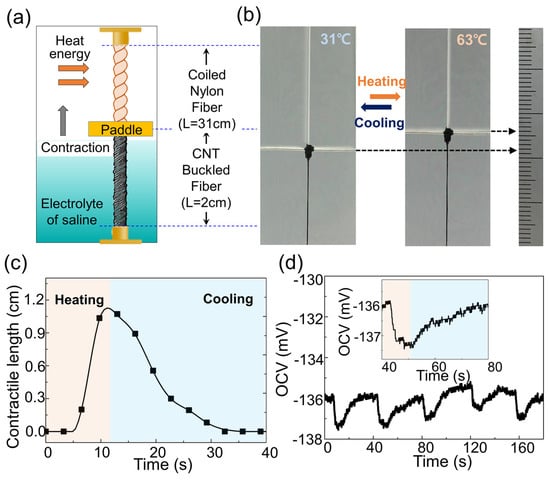 MEH fiber with TAM for self-powered strain–temperature dual-parameter sensor: (a) schematic of integrated MEHTAM fiber; (b) optical image of MEHTAM system; (c) the contraction length and tensile stroke of the TAM in the MEHTAM system were time-dependent when the fiber was being heated or cooled; (d) OCV response of MEHTAM system, due to temperature change. Inset: magnified OCV output from 40 to 80 s at extremely low frequency. The red and blue areas correspond to the heating and cooling states of the coiled nylon, respectively.