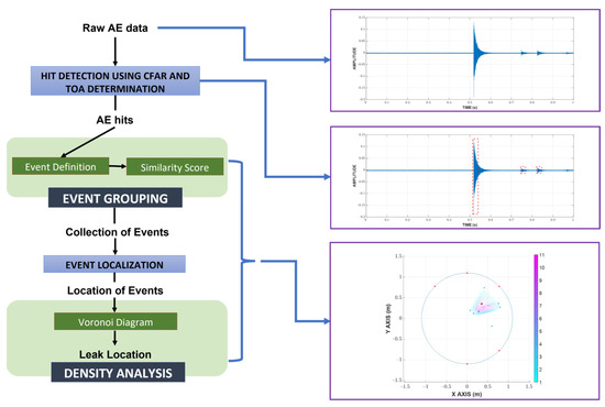 Prior to a detailed discussion of the methodology, an overview of the proposed process is given in Figure 1. Initially, raw AE data is processed with a CFAR for hit detection, whose results are further investigated with fixed thresholding to determine the TOA and end time. Afterward, hits from the same origin are grouped together using the event definition and similarity score. Using the newly grouped hits, the locations of events can be calculated using TDOA, which are eventually analyzed with a Voronoi diagram to return the final estimated leak location.