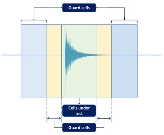 The CFAR was originally developed in radar systems for target detection [28]. The principle of a CFAR is to set a power threshold, which distinguishes possible real target hits from the rest (i.e., those considered to originate from spurious sources). The calculation of this threshold is governed by a constant false alarm rate (hence the name) as the trade-off metric between true targets and false ones. In real-life problems, due to many factors, the noise can affect the data both temporally and spatially. Therefore, such difficulties render fixed-threshold-based methods ineffective. A CFAR approaches this problem by adaptively adjusting the threshold level regarding the probability of false alarms, thus lowering the susceptibility to real-life noise. Since its first introduction to radar systems, the CFAR has also been harnessed in other fields due to its advantage in the presence of colored noise with unknown variance. For this research, the average CFAR is employed to detect AE hits from the recorded AE sequences. In order to manage one-dimensional time series such as those investigated in this study, the model displayed in Figure 2 can be used.