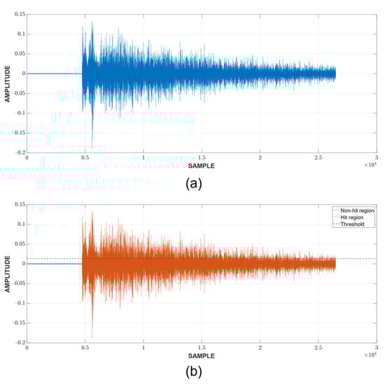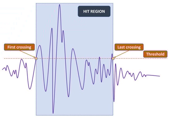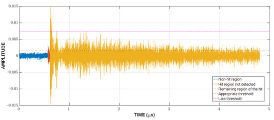 Since the localization of events is achieved through TDOA, CFAR can only show whether or not a hit is present in the CUT. The next step is to detect the time of arrival (TOA) of hits. In this study, the duration of a hit, which is marked by the TOA and the end time, is determined with a fixed threshold method [23,29,30], which is popular among existing acquisition systems. An appropriate threshold selection is necessary because a low threshold can trigger a premature detection due to noise and a high one can miss the actual TOA by a considerable margin, as can be seen in Figure 3. The first and last threshold crossings are registered as the TOA and end time, respectively. The visualization of this process can be found in Figure 4.