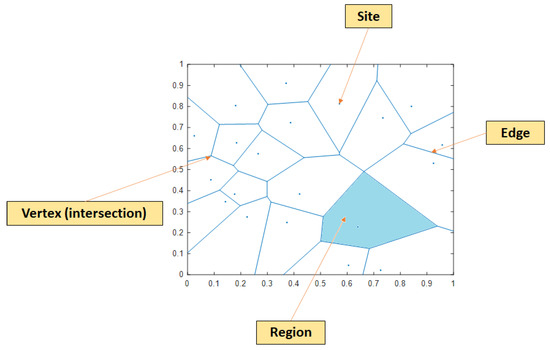 The Voronoi diagram’s history can be traced back to the 17th century. Throughout the years, it has been known by a few other names, such as Dirichlet tessellation or Thiessen polygons. The core idea of a Voronoi diagram is rather straightforward: given N points in a plane, it tessellates that plane into N convex polygons (also known as regions), each of which is generated from one point (also known as a site), and every point within that region is closer to the generating site than the other ones. The visualization of a Voronoi diagram can be seen in Figure 5.