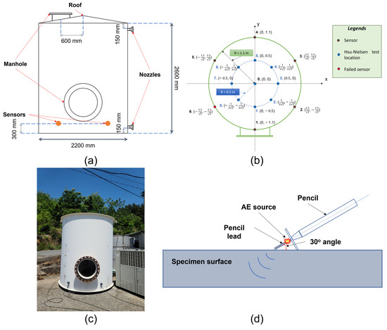 The cylinder tank under test: (a) vertical dissection schematic and vertical sensor displacement (b) horizontal dissection schematic, sensors and Hsu-Nielsen test location (c) pictorial depiction of the test setup (d) Hsu-Nielsen test visualization.