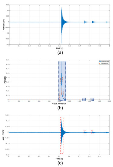 An example of the hit detection process and result are shown in Figure 7. As previously discussed, a hit is detected when the CUT exceeds the threshold calculated from the neighboring cells. However, this only implies that the CUT contains a hit; it does not show the arrival and end time. A fixed threshold of 10% of the peak value, which is calculated in the current CUT, is chosen to mark these important timestamps of the hit. Since there are a large number of hits, Figure 8 shows only the example of a CUT region along with the TOA and end time determination from the respective CUT region. It can be seen that the threshold is capable of detecting the hit’s TOA quite similar to how it would be picked manually.