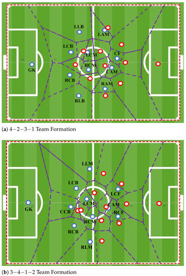 Voronoi diagrams for analysed teams (blue) in two team formations ((a) 4-2-3-1 and (b) 3-4-1-2) and the opposing team (red).