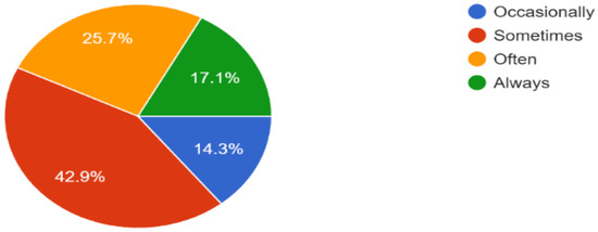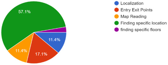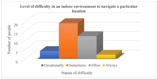 Furthermore, according to the responses of 37 people from different groups, in multistory buildings, they mostly face difficulty finding a specific location, and sometimes they need assistance for entry and exit points, as shown in Figure 2 and Figure 3.