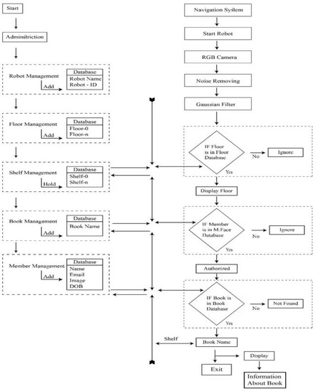 - The proposed system consists of three basic and important modules (image recognition, speech recognition, and voice broadcasting). The developed system uses image processing techniques to recognize a person, speech recognition to get the user’s requirements, and voice broadcasting to help navigate on each floor of the building. In the proposed system model, a user gets registered using an Android app, where basic personal data are collected from him or her with real-time images. The real-time images are then used for face recognition to authenticate him or her on each floor of the building. After getting registered, the user is directed to the robots for the required book, and until the task is completed, the user is given directions on each floor. The proposed system model is generalized and can be implemented in any indoor environment; and