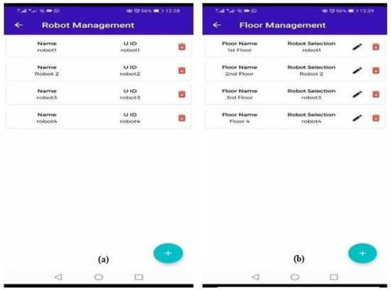 Robot management is used to add or remove a robot from the system. For every floor, there is a robot, and the number of robots is equal to the number of floors. Every robot in the robot management module has a unique name and ID, which are used to guide the customer on each floor of the building. Figure 6a shows the backend of the robot management module.