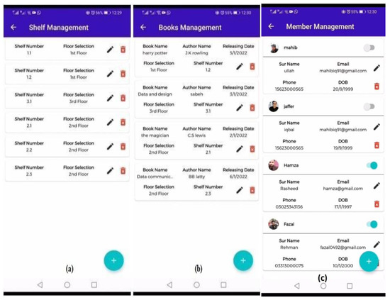 Sub modules (Shelf, Books, and Member management) of Indoor robot system app. (a) Shelf management. (b) Books management. (c) Member management.