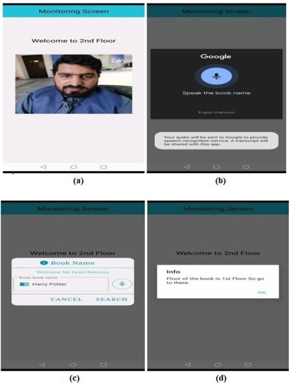 In the monitoring screen, the front or back camera (depending on place of usage and administration requirements) of a mobile phone stays on until a face is detected and recognized using the Tensorflow Lite library for Android [27]. The first step of the monitoring screen module is to recognize the user using a face recognition algorithm. The robot will announce the name of the user if he/she is already registered in the system, as shown in Figure 9a. The monitoring system also recognizes the location of the user, such as on which floor he or she is. Once a person is identified, the next step is to obtain input from that person regarding the required book, in the case of a library. Input from the user can be in the form of voice (Figure 9b), which is converted to text using Google API services for voice to text, or if the person is non-vocal, he/she can just enter the required book name using the keypad of the screen (Figure 9c). The robot will assist the user in finding out the location of the book, i.e., on which floor the book is and on which shelf it is placed, as shown in Figure 9d.