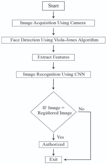 The image of the user is acquired with the help of an RGB camera and then passed to the Viola Jones algorithm, which detects different points on the face. After this, different features are extracted from the acquired image and passed to the classification algorithm, i.e., CNN. CNN classifies the image and determines whose image it is; the user’s registration status is then checked. If the user is a registered user, then he or she is authorized to have access to each floor and book of the library. If the person is not a registered user, his request to use the library is denied.