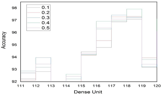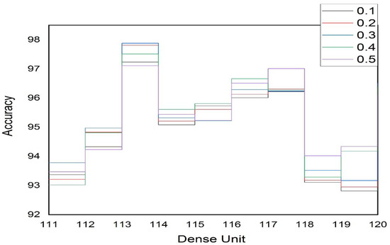 Based on the accuracy results, we also tried to figure out the ideal number of dense units for hidden layers for voice recognition, which is pretty close to facial recognition. In order to assess the accuracy of the results and the fit rate of our proposed CNN, we also routinely tested the dropout rate. As shown in Table 2, the highest accuracy value was obtained for voice recognition when we used a dropout rate of 0.4 and a dense unit of 118. Indeed, the dropout rate we tested ranged from 0.1 to 0.5, increasing by 0.1 when the dense units were between 110 and 120. Figure 13 depicts the accuracy value as a function of the density unit number and the dropout rate.