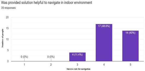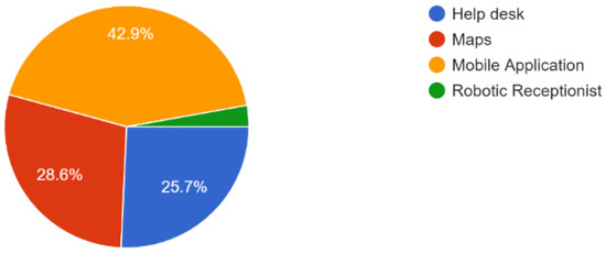 The second step in evaluating the proposed model’s performance is user evaluation, which determines whether or not this system is beneficial to society. To do this, we conducted user evaluations of our proposed system. Keeping in mind the importance and need for a multistory navigational system, we conducted a comprehensive survey of application users in the form of different questionnaires. According to the survey report, more than 40% of the users get mobile application-based assistance, as shown in Figure 14. This proves the need for a solution consisting of mobile applications because people are already used to them.