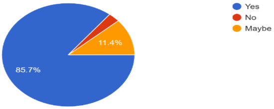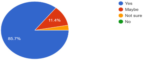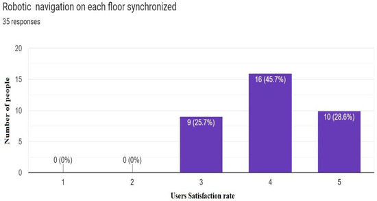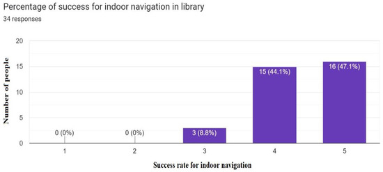The success of indoor navigation depended on achieving the targeted navigation in the library, and out of the 34 responses shown in Figure 21, more than 80% successfully navigated to a required book in the library while interacting with the provided solution. Lastly, based on the experience of users of our solution robotic application, 85% of the people recommended that the same idea can be implemented in other multistory buildings, as shown in Figure 22 and Figure 23, which proves that it is one of the best solutions for indoor navigational environments.