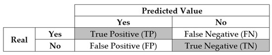 The confusion matrix is a very popular measure used in solving classification problems. It can be applied to binary classification and to multiclass classification problems [26]. An example of a confusion matrix for binary classification (2 × 2) is shown in Figure 2.