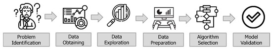 In this paper, the ML classification was divided into six steps: problem identification, data obtaining, data exploration, data preparation, algorithm selection and model validation. Initially, it is very important in ML classification to identify the focus of the problem to determine the feasibility of the procedure. The second step was to obtain the data. Subsequently, the exploration and preparation of the data were carried out so that, finally, the algorithm selected for this problem could be used. The last step of this classification process (model validation) was to analyze whether the results obtained were consistent from the validation of metrics. The steps mentioned are shown in Figure 3 [28].